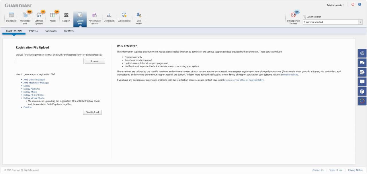 The registration process lets you capture installed hardware identification information and software revisions. The process also links your system's content with Emerson's technical information to provide you with customized delivery of information relevant to the system. To provide system-content-specific service notification, effective product support, and up-to-date Guardian platform information, an updated registration file needs to be submitted on a regular basis.